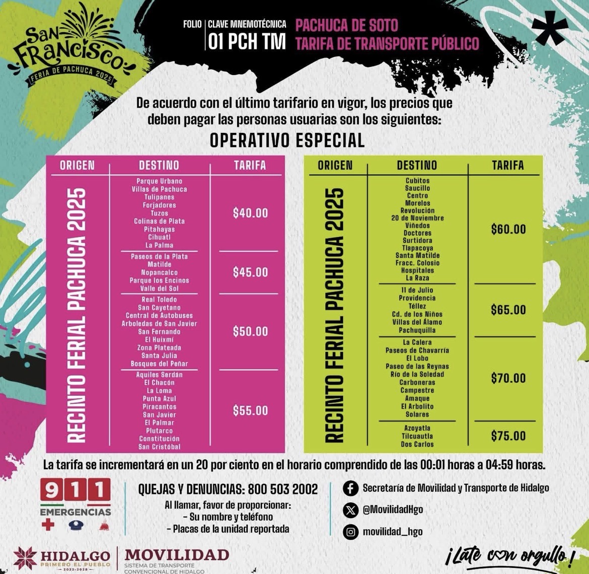 El tarifario especial, vigente durante todo el periodo ferial, establece precios fijos por trayecto desde las instalaciones de la feria hacia diversos puntos de la capital hidalguense. Según el documento oficial publicado por la Semot, las tarifas oscilan entre los 40 y 75 pesos, dependiendo de la distancia y el destino. Algunos ejemplos clave incluyen: