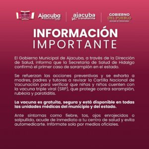A través de la Dirección de Salud, informa que la Secretaría de Salud de Hidalgo confirmó el primer caso de sarampión en el estado.